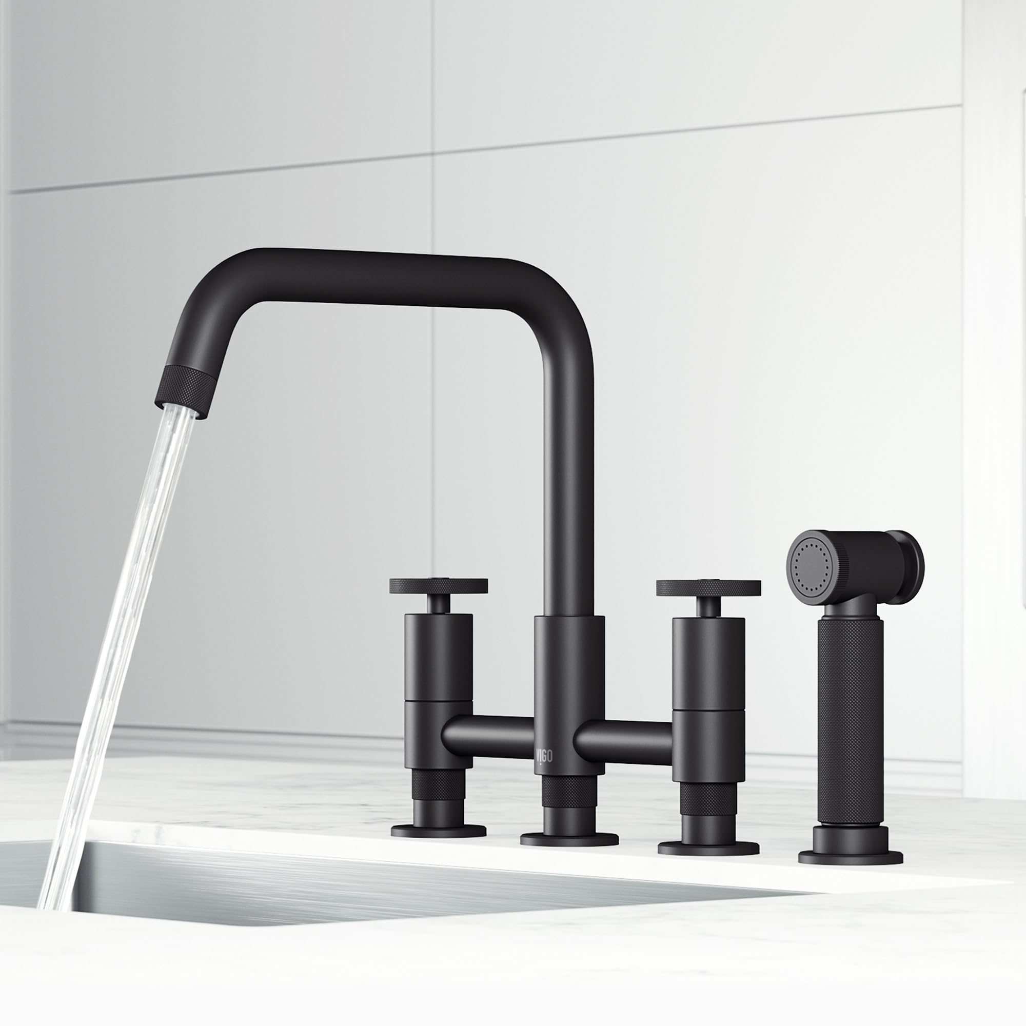 VIGO Cass 12'' H Double Handle Widespread Bridge Kitchen Faucet with Pull-Out Sprayer in Matte Black-VG02051MB