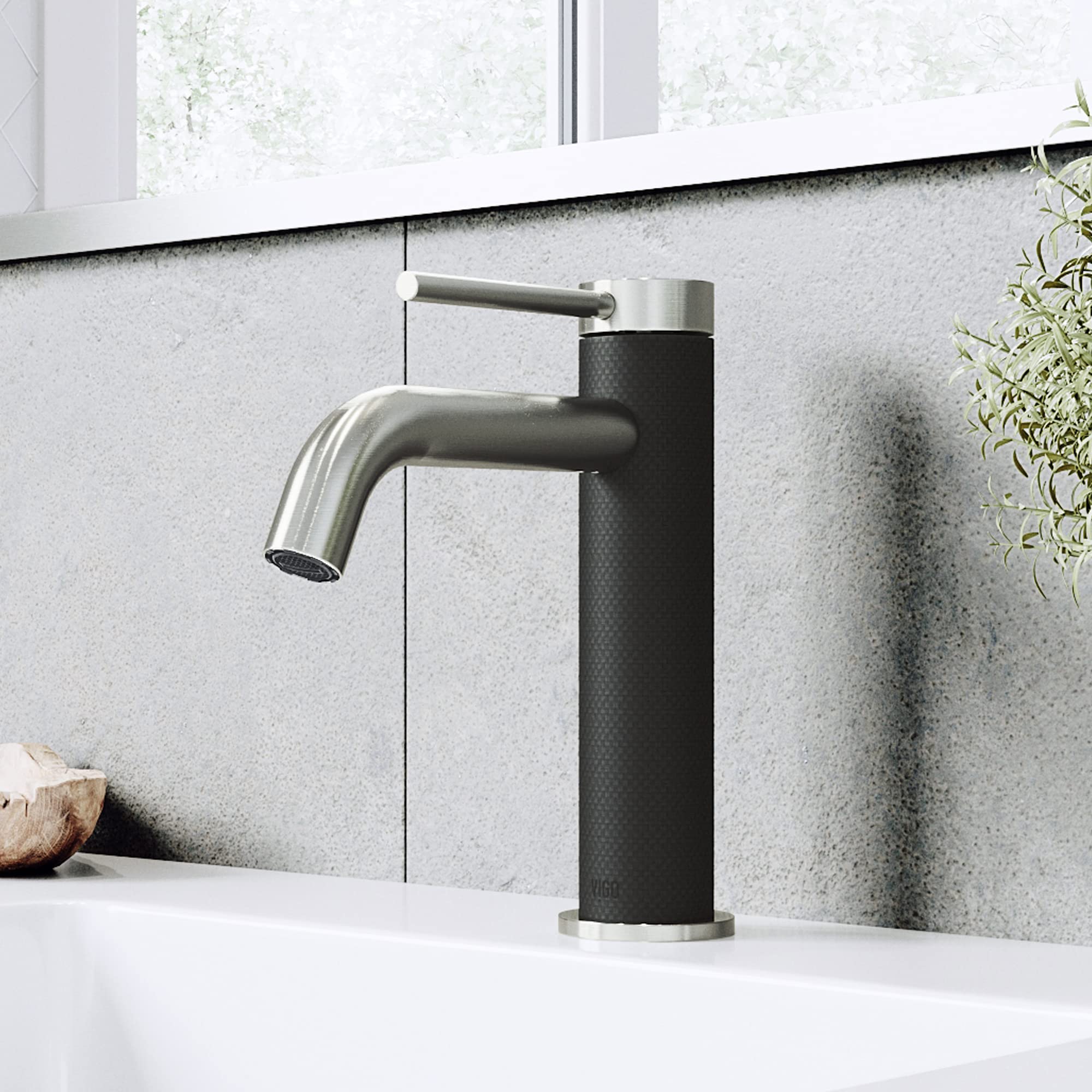 - LUXURY REDEFINED: This 8" H single-hole cFIBER bathroom faucet combines carbon fiber with brushed nickel, chrome, matte black, and matte brushed gold finishes to create a distinctive design.
