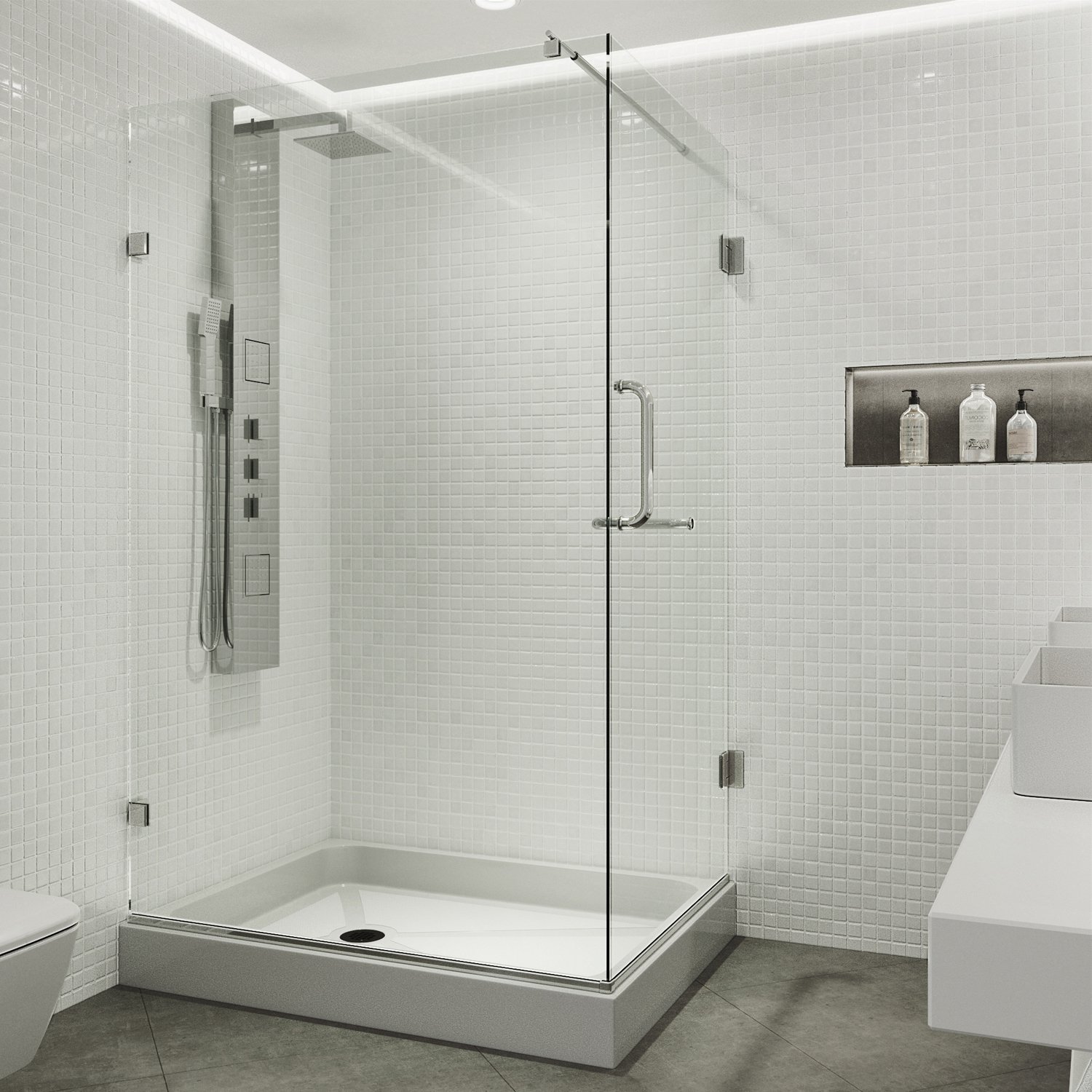 - CORNER SHOWER KIT: This 48" W x 36" D x 79" H corner shower combines a hinged glass design with an acrylic base featuring a textured floor for slip resistance and includes a 33-inch entry space.